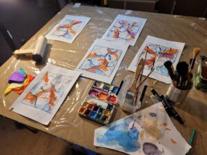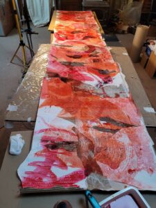 Certains tableaux longtemps oubliés dans l’atelier retrouvent une seconde vie. Je les recycle et les intègre dans les nouvelles œuvres. Avec le temps, mon regard sur ces anciennes créations est devenu plus critique; elles deviennent alors un terreau fertile pour un nouveau travail.Je fabrique mes encres à partir de pigments rapportés des carrières de Rustrel. J’utilise et réemploi des cartons alvéolés et ondulés. Je déchire différents papiers pour les assembler et superposer sur mes surfaces picturales. Les dispersions et les désordres, sous forme de ruptures rythmiques, sont prédominants cette réalisation.