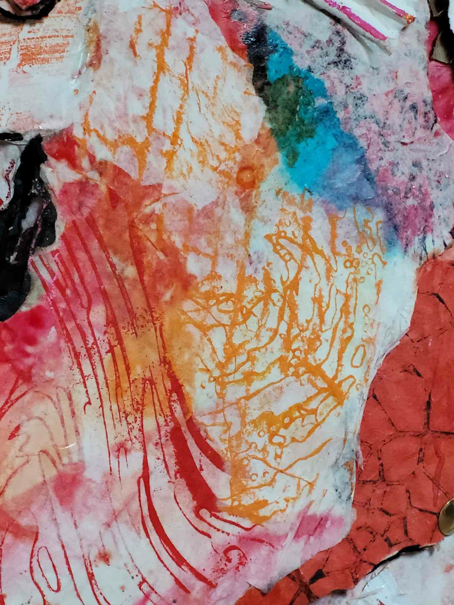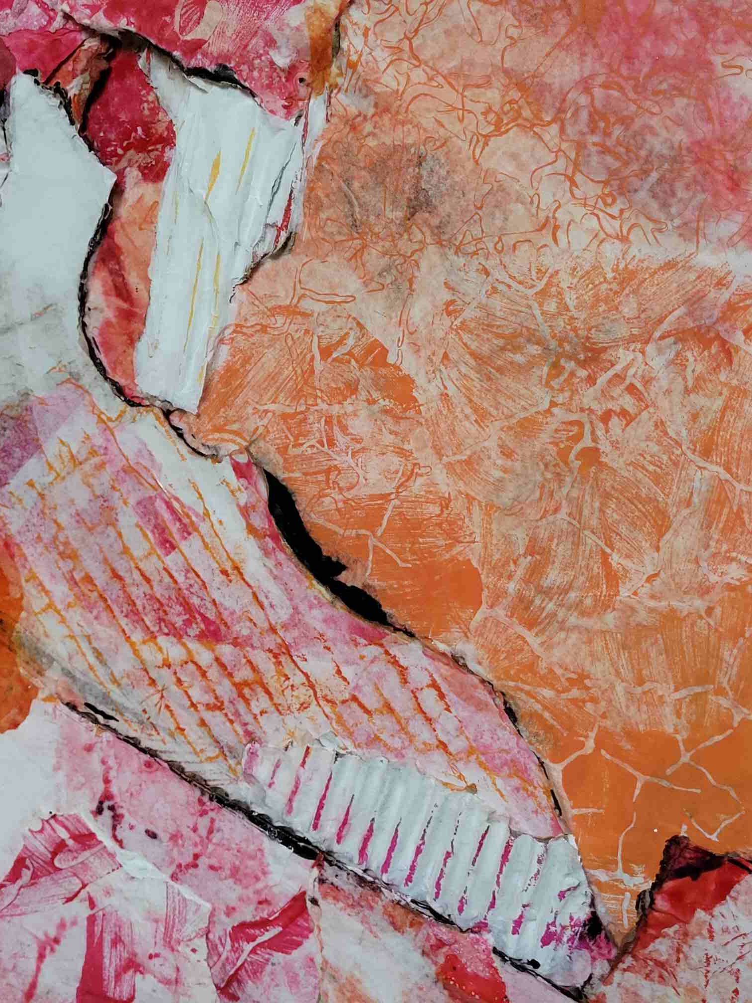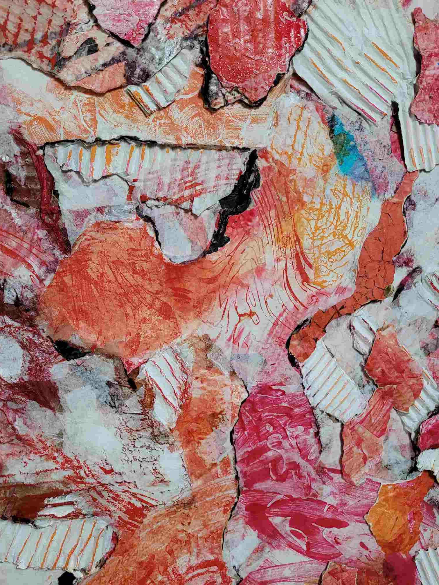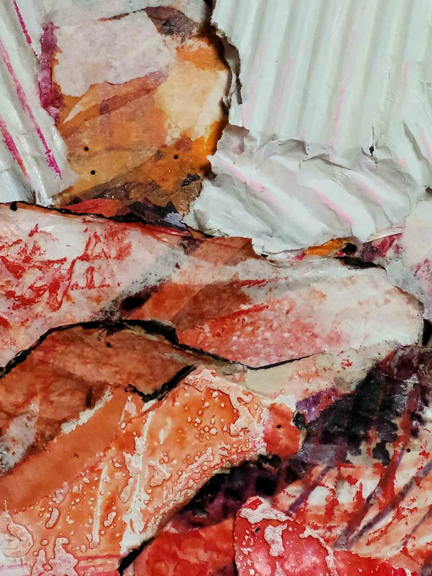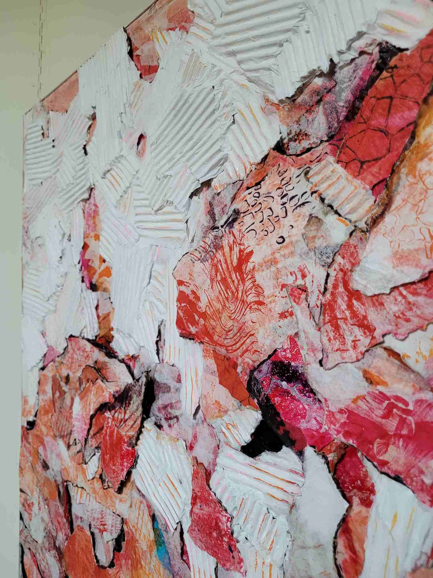 Sur le plan technique, l’utilisation du carton ondulé, exploité avec l’effet recto/verso, offre d’un côté, la tempérance du lisse et de l’autre, la vigueur des ondulations à vif. Ces hachures en relief insufflent à la composition la nervosité recherchée. J’opte pour une superposition de collages afin de créer des stratifications, où chaque morceau déchiré, aux bords irréguliers, exprime le « mordant » des éclats. Usures, craquelures, dislocations et ruptures rythmiques dialoguent avec la dureté du carton, tandis que l’adjonction des papiers (soie, de chine, kraft…)traitées avec des encres colorées et des pigments, animent le tableau de façon autonome. Le blanc non peint du papier agit comme une respiration salvatrice, une pose, et le noir « sous-terrain » souligne quant à lui les pièces éparses. Enfin les voiles de cellulose, préalablement gaufrés, se révèlent particulièrement sensibles à l’irrigation des liquides: ils captent le flux des tracés des pinceaux et accueillent les empreintes colorées. Dans ce paysage chahuté, l’œil fouille et déniche un passage, celle d’une interprétation libre et intime…