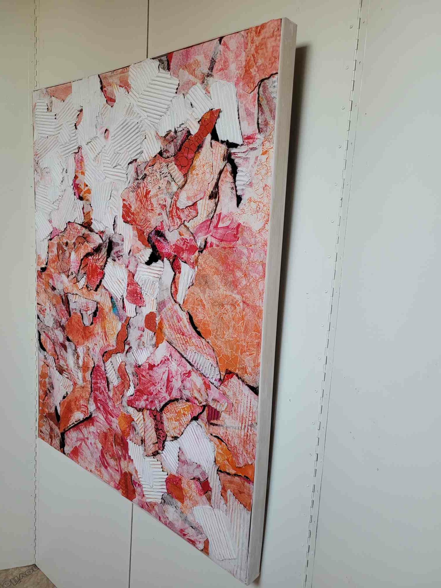 ‘‘Le choix du thème des éclats s’est imposé à moi comme une évidence, car il est dans la continuité de ma démarche artistique. Au milieu d ’année 2025, j’avais exploré de nouvelles techniques dans un triptyque de grande dimension intitulé « Fragmentations ». À l’époque les papiers , encres, pigments et le carton effleuraient la surface du tableau, esquissant les prémices d’une recherche plastique que j’approfondis aujourd’hui. Dans cette première variation du tableau « Eclats –variation 1 » les matériaux prennent une place plus affirmée, sans doute sous l’influence de l’artiste sculpteur Eva Jospin. Cette inspiration me pousse à poursuivre l’exploration en volume, avec deux nouvelles variations en perspective sur 2026.