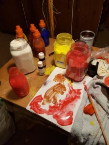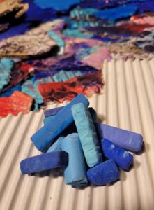 Le choix du papier (blanc ou de soie colorée) et du carton n’est pas anodin. Ce sont des matériaux fragiles, communs, souvent considérés comme éphémères. Pourtant l’art n’offre-t-il pas cette opportunité d’une deuxième vie, sans doute plus éternelle ? La déchirure devient un acte fondateur : elle fragmente pour mieux recomposer.  Cette économie du geste s’inscrit dans une réflexion sur la matérialité de l’œuvre et sur son empreinte écologique.                                                       Les papiers sont recouverts d’encres colorées « maison », réalisées à partir de pigments. Ces paysages survolés visuellement sont rehaussés de poudres de pastels secs. Ces couleurs simples et ancestrales participent d’un protocole de fabrication volontairement sobre, limitant l’impact environnemental. Leur intervention participe au « puzzle impossible », en évitant d’utiliser des peintures polluantes. La matière, la couleur, la lumière et l’ombre, participent d’un dialogue constant entre construction et effritement.